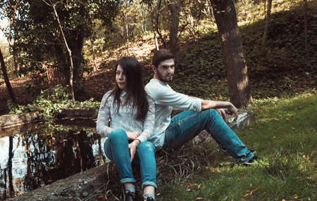 A young woman and a man in front of the blurred trees. A heterosexual couple. People strolling through an autumn park or forest. Selective focus.