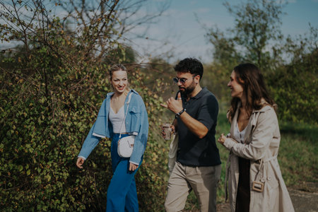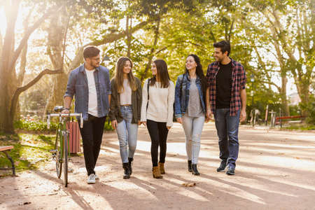 Few friends are enjoying sunny autumn weather while hiking in the forest.