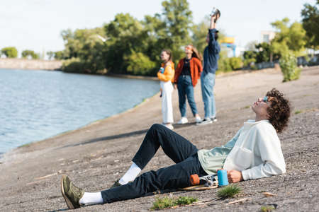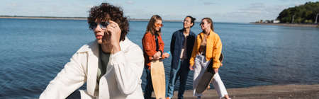 curly man in trendy sunglasses near multiethnic skaters talking by river, banner