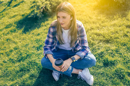 Young Woman in headphones sitting on the grass outside in park at sunset. Happy and smiling girl listening music and drinking coffee. Relax and meditation.