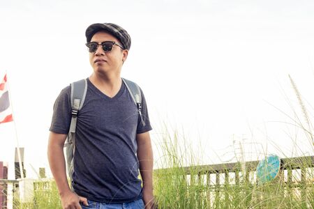 Man wearing sunglasses and a hat with a shoulder bag standing in the concept of tourists. Men wear a T-shirt and jeans with lifestyle to tourists.