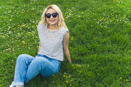 blond Caucasian girl leaning on the green grass and smiling to the camera medium full shot outdoors. High quality photo