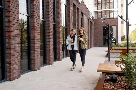 Teenage female twins watching video in smartphone while moving down road in urban environment