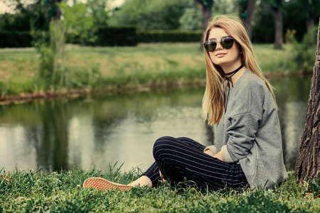 Pretty teen girl with long blonde hair relaxing under the tree in the park. Beauty, fashion. Teen style.