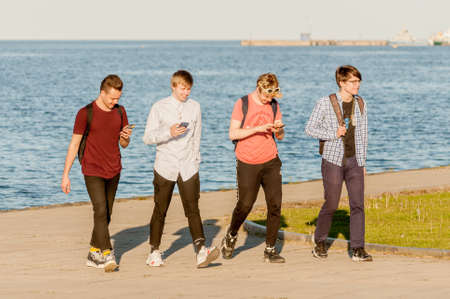Petrozavodsk, Russia - 13 Juny 2020. four guys teenagers walk along the embankment on a summer day. Happy faces