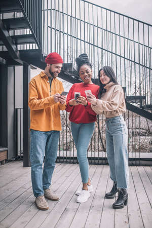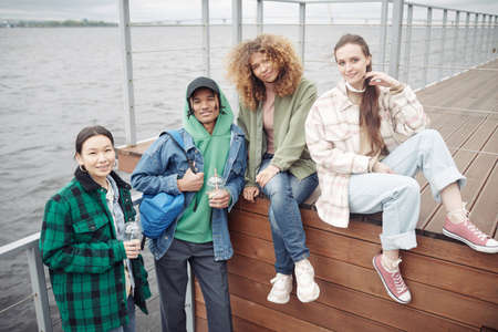 Four happy and friendly teenagers in casualwear looking at camera while resting on wooden pier on weekend or after classes in college