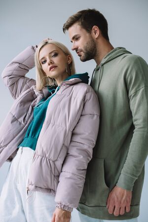 stylish blonde girl and bearded man in autumn outfits isolated on grey
