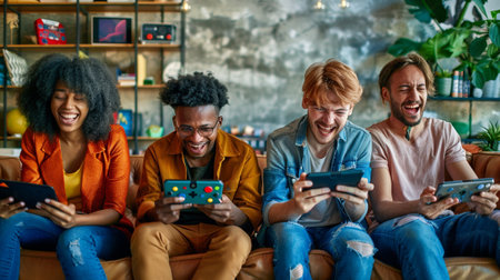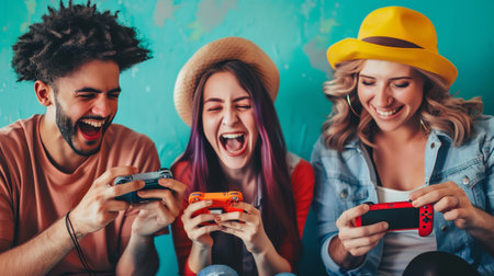 Cheeful young friends having fun spending leisure time together at home, playing video games