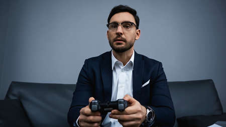 Addiction and dependency concept. Young man with pad joystick playing games. Male addicted to console playstation videogames.