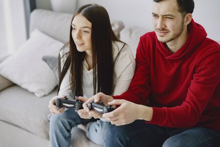 Young married couple playing video games on general gaming console. Details of modern lifestyle with couple having fun