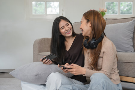 Lesbian LGBTQ women couple play video game at home. Young Asia lady using wireless controller having funny happy moment on sofa in living room at night. They have great and fun time celebrate holiday.