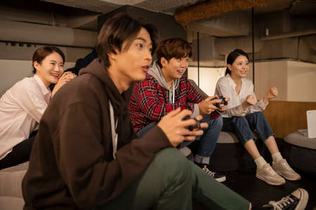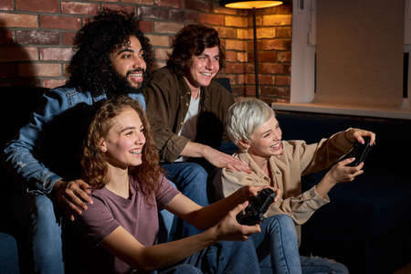 Cheerful joyful guys and ladies playing game console at home, enjoying rest, leisure time, as hobby at weekends. Women holding gamepad joysticks in hands, concentrated