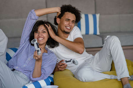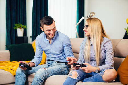 Young married couple having fun with modern technology console online, playing videogames and enjoying the weekend