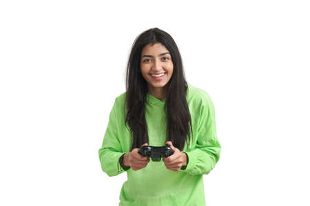 Happy young Venezuelan woman playing a videogame with a joystick. Isolated over white background.