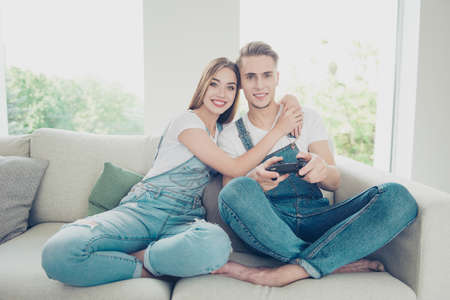 Young attractive cute caucasian couple wearing casual jeans overall, playing online video game, girl hugging guy