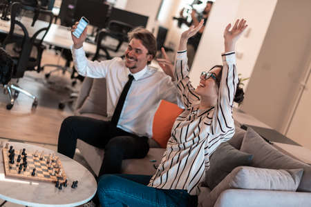 Multiethnic group of business people playing chess while having a break in relaxation area at modern startup office