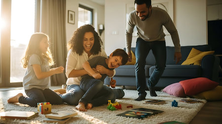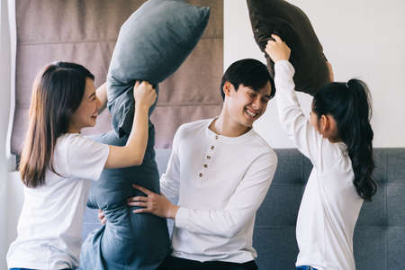Asian-African American family relaxing, chatting, painting and having fun on vacation in the living room of the house