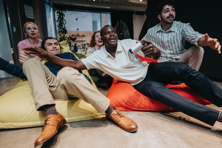 Group of individuals engaging in a lively gaming session together on colorful beanbags