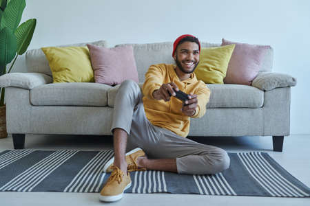 Young couple sitting on the floor at home. Portrait of wife and husband have fun playing video games with a joystick. stay at home.