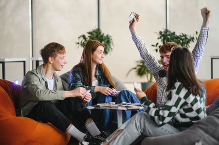 Group of happy friends playing a board game together, enjoying their leisure time with excitement and laughter