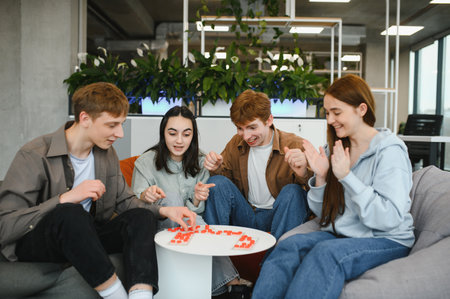 Group of young colleagues enjoying a break, playing a captivating board game in a vibrant, contemporary office environment