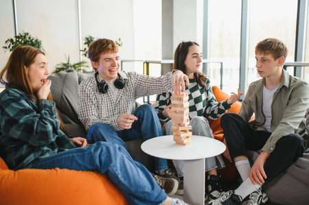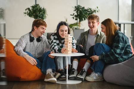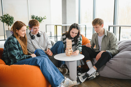 Four young colleagues are enjoying a break, playing a block stacking game and having fun together in a modern office space with comfortable beanbag chairs