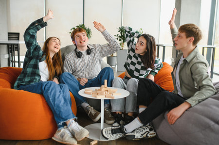 Group of cheerful young adults having fun time playing wood blocks stacking tower game at home