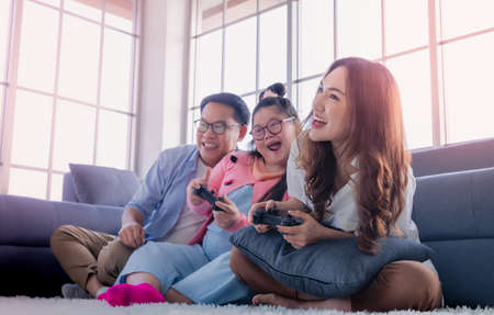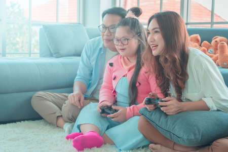 Asian Family with Down Syndrome kid is playing Video Game on the floor with excitement expression.