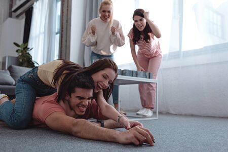 cheerful girl trying to take toy figurine from guy lying on floor and excited girls standing on the background