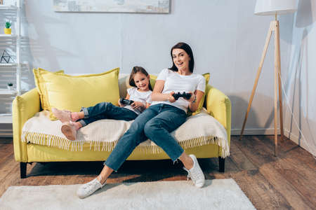 Full length of cheerful mother and daughter looking at camera while playing with joysticks on couch