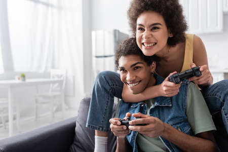 KYIV, UKRAINE - NOVEMBER 9, 2021: Focused african american woman playing video game with boyfriend at home