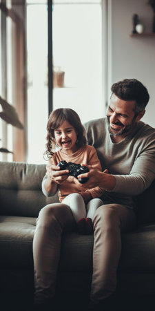 Generative AI : Young happy man father and excited daughter celebrating victory while playing video console games together playful dad spending time with child while relaxing on co