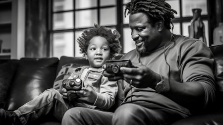 Generative AI : Happy ethnic african american family father and daughter laugh and play video games together using a video game console n christmas holiday