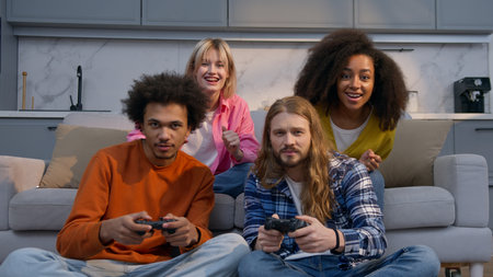 Multiethnic African Caucasian friends men women playing console video game at home competition fun win lose diverse four group males females buddies friendship support gaming joy entertainment indoors