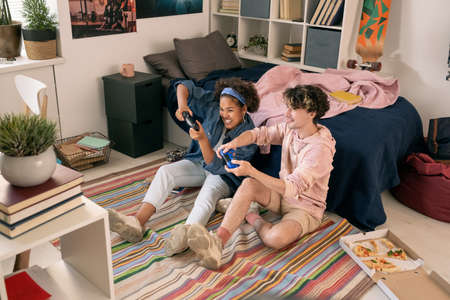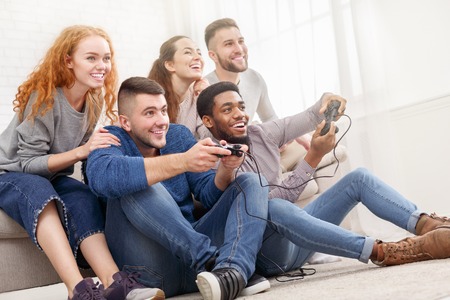 Cheeful young friends having fun spending leisure time together at home, playing video games