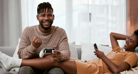 Yes Next level. a handsome young man playing video games while relaxing on the sofa at home with his wife.