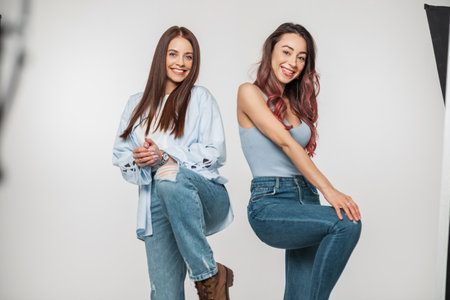 Two funny beautiful cheerful girls in fashionable denim casual clothes poses and have fun at a photo shoot on a white background in the studio