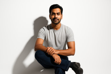 Handsome Indian man sitting front facing with ankle crossed over knee resting forearms on leg calm confident expression studio portrait on white