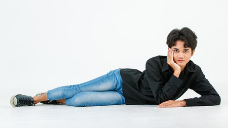 Portrait isolated cutout studio shot of Asian young LGBTQ gay glamour male model in casual black shirt and jeans outfit sitting stretching posing gesturing on floor look at camera on white background.