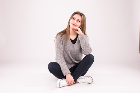 Pretty beautiful young woman posing on studio sitting on the floor