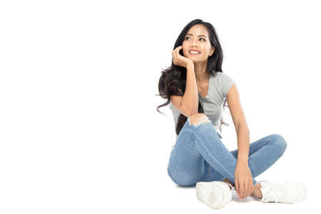 A young Asian woman wore a casual dress on the floor. She looks at the copy space. She daydreams. Isolated on white background