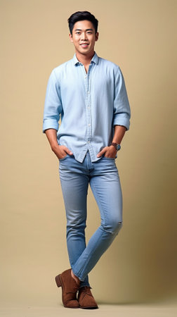 Perfect man Handsome young man in blue jeans shirt keeping hands in pockets and looking at camera while standing against grey background : Generative AI