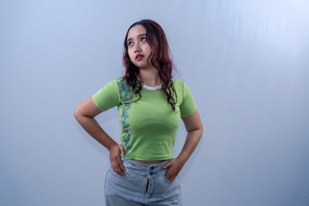 Asian Indonesian woman wearing green clothes looking up