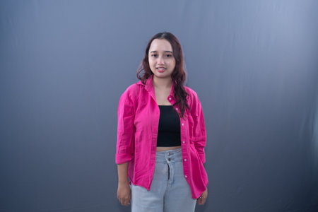 Smiling young woman in casual attire against a soft gray background