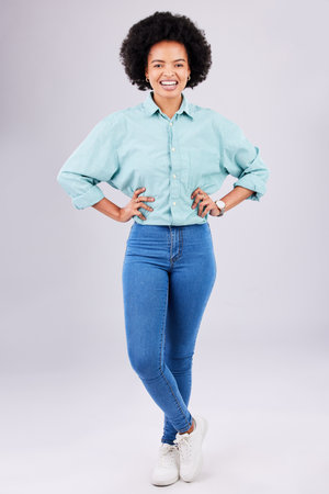 Fashion, relax and portrait of black woman with stylish clothes standing isolated in a studio white background. Happy, excited and confident female person crossed legs in trendy outfit or clothing