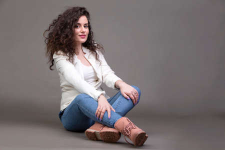 A beautiful brunette girl of regular physique with curly hair in jeans on a gray background.