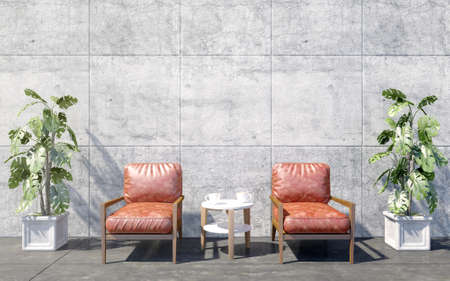 Loft living room interior with red retro arm chair and coffee table and decorative plants