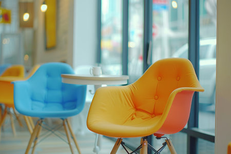 Close-up of an inviting cafe scene, featuring colorful chairs in yellow and orange. A round wooden table is surrounded by seating, suggesting a space for collaboration and relaxation.