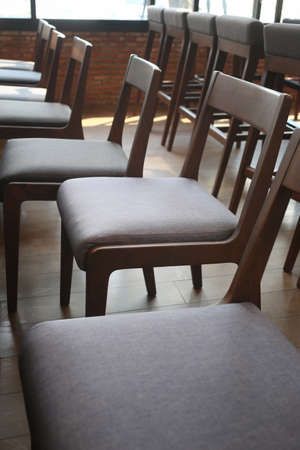 beautiful backrest brown chair for meeting at coffee shop and fast food blurry bokeh background.wooden chair for sitting and eating meal at beautiful restaurant blurry bokeh background.