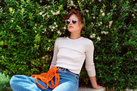 Young woman in light summer clothes with a reusable mesh eco bag and sunglasses, sitting bench at summer park before shopping. sustainable lifestyle. Eco friendly concept.